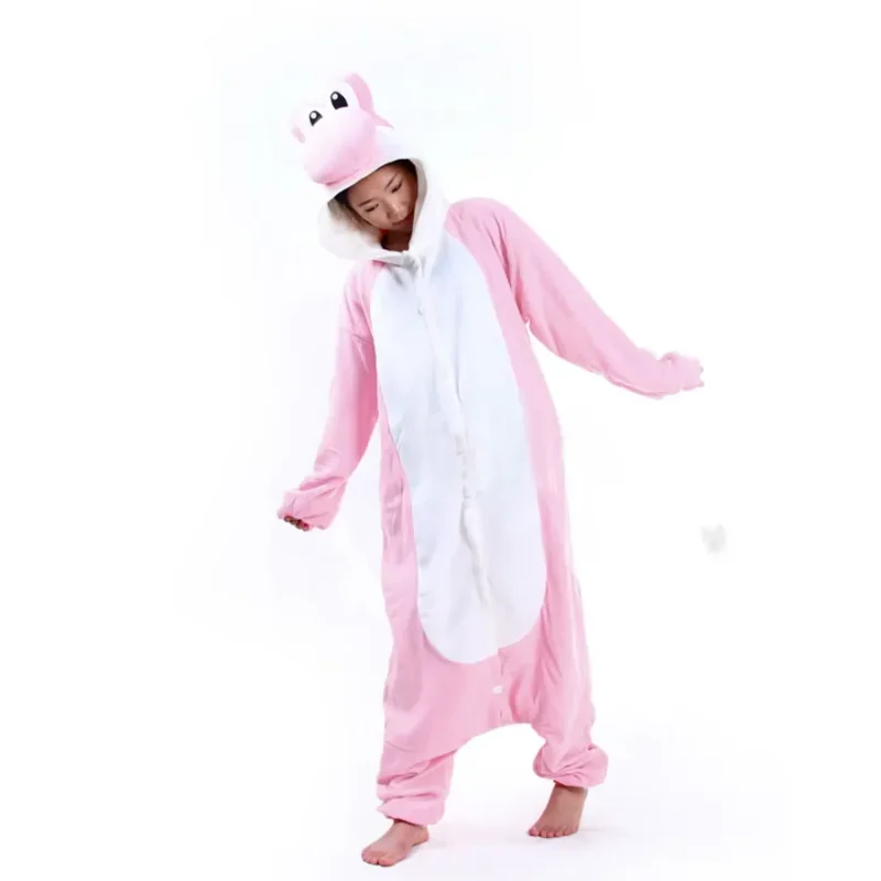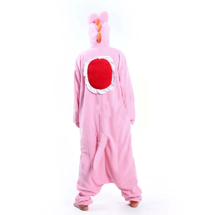 This Pink Yoshi costume onesie is perfect for adults. Ideal for cosplay, Halloween, or as comfy pajamas, it features the iconic Super Mario Bros character for fans to enjoy.